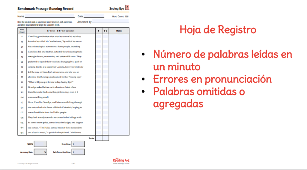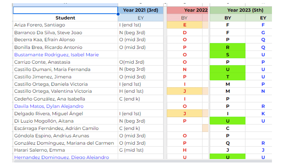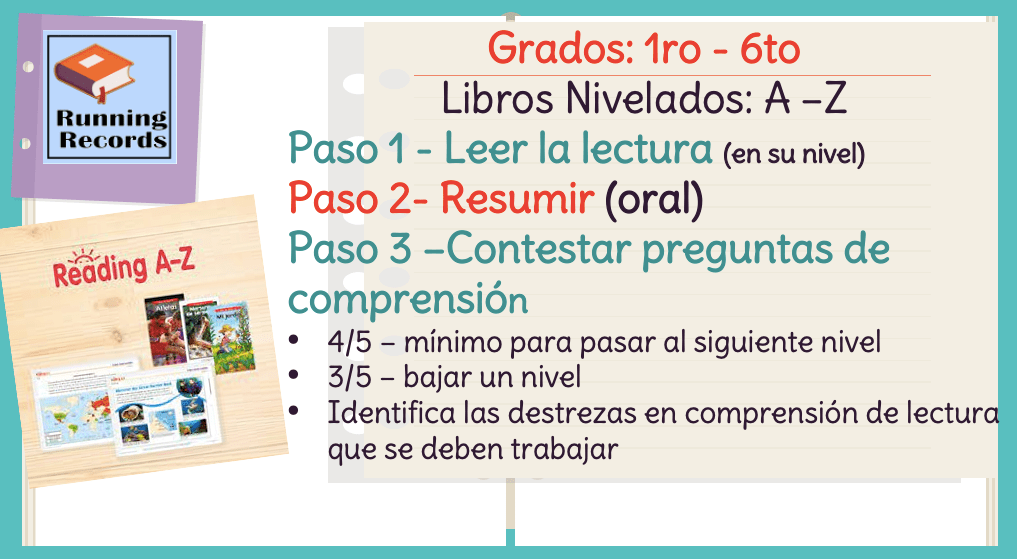 Teacher Pilar, coordinadora de Inglés de secundaria, explicó la aplicación de running records y el diagnóstico ortográfico.